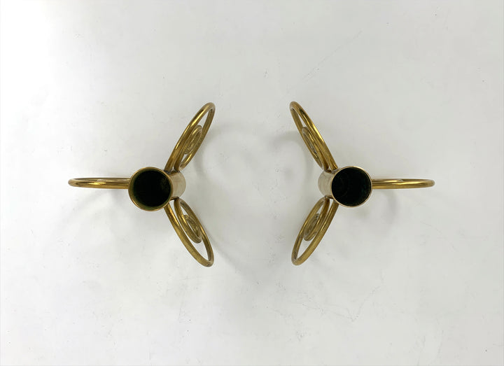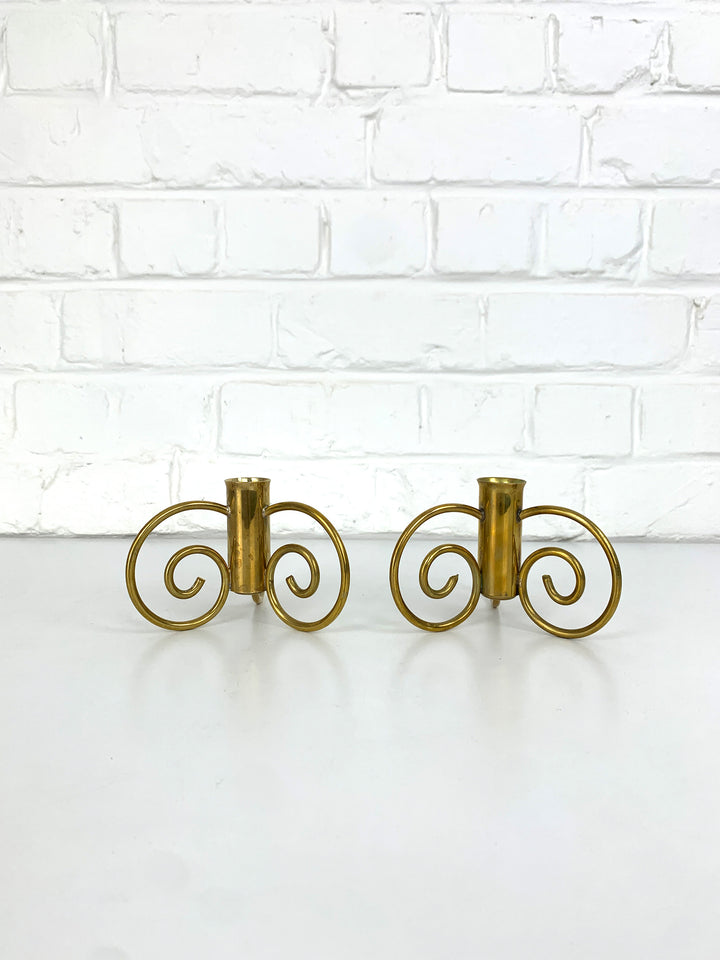 Elegant pair of Swedish Modern candlesticks in solid brass, dating from the 1950s. Each piece features a central tubular element designed to hold one candle. This central element is supported by three finely curved spiral-form feet, set perpendicularly to the tube, giving the design a balanced yet sculptural presence.
