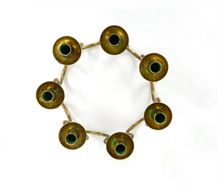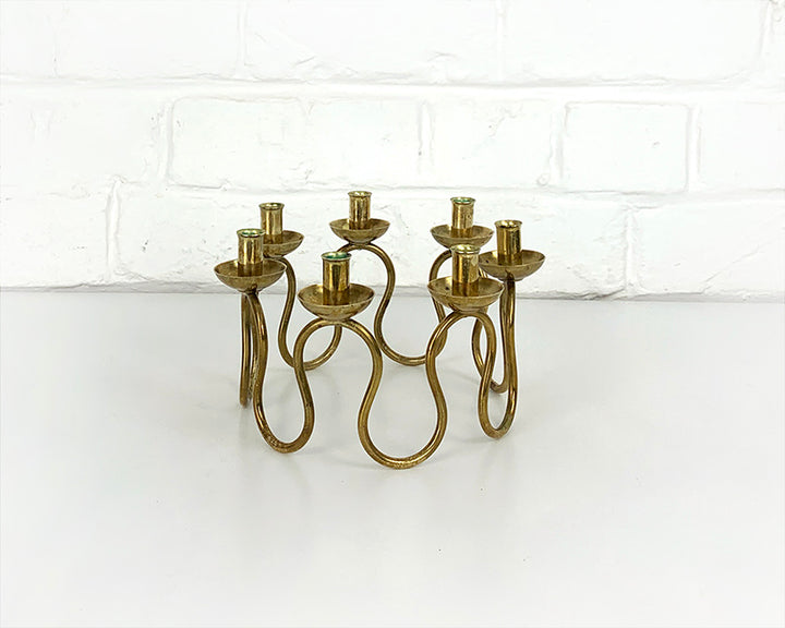 A striking candelabra in solid brass, designed by Lars Holmström for Svenskt Tenn. This sculptural piece features a sinuous, tubular structure rising from a circular base, supporting seven cylindrical candle holders in a harmonious rhythm. The organic curves give the piece both a sense of movement and timeless elegance.