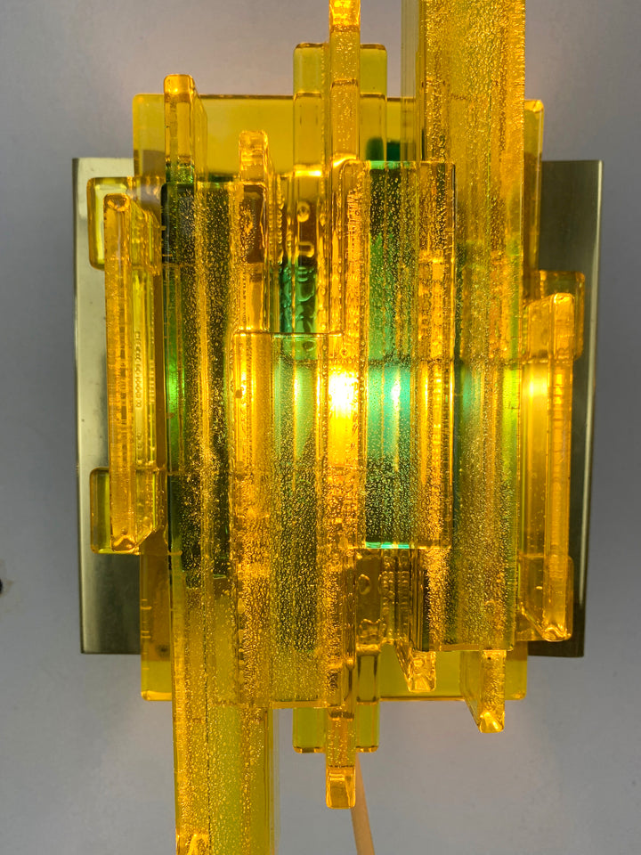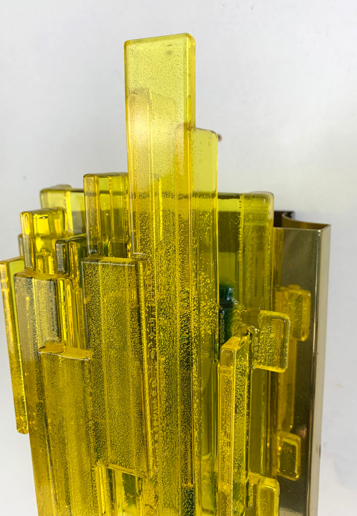 A composition of yellow acrylics geometric elements are melted together with inclusion of air bulbs.