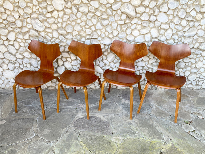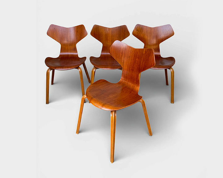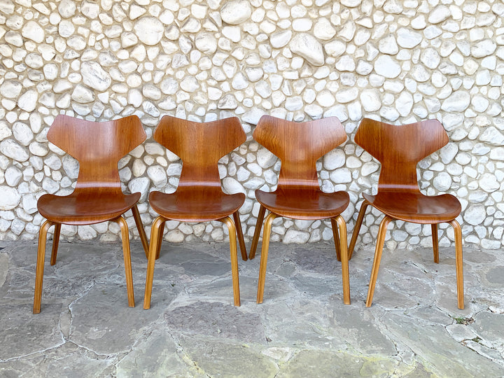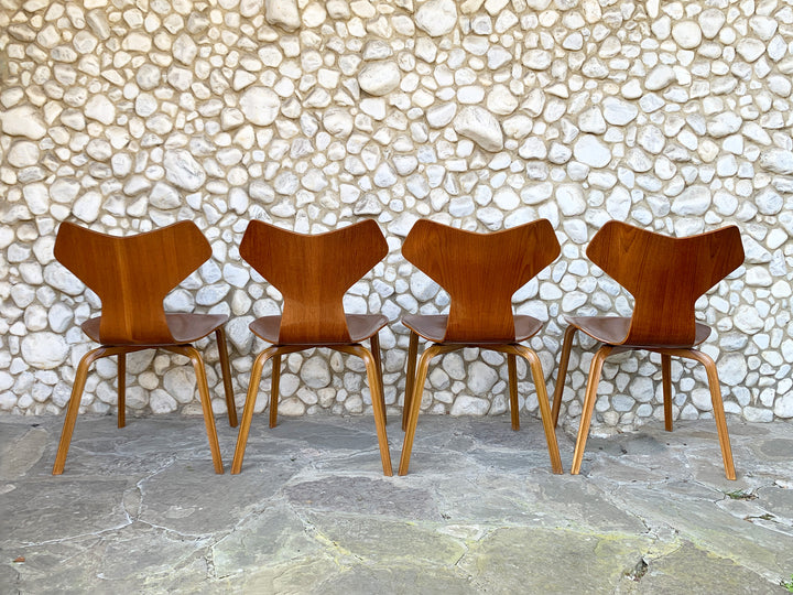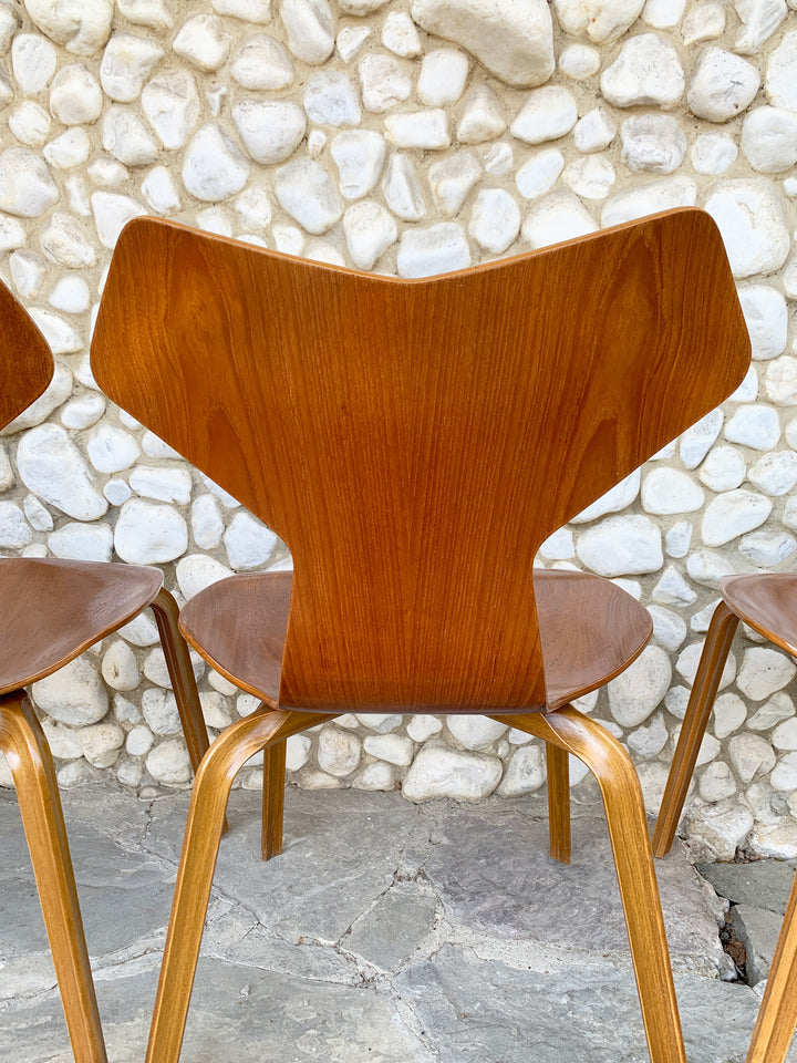 Set of 4 Grand Prix chairs (model no. 4130 by Arne Jacobsen. Produced in the 1950-60s for Fritz Hansen, Denmark. Seats in plywood with teak veneer, legs in birchwood.