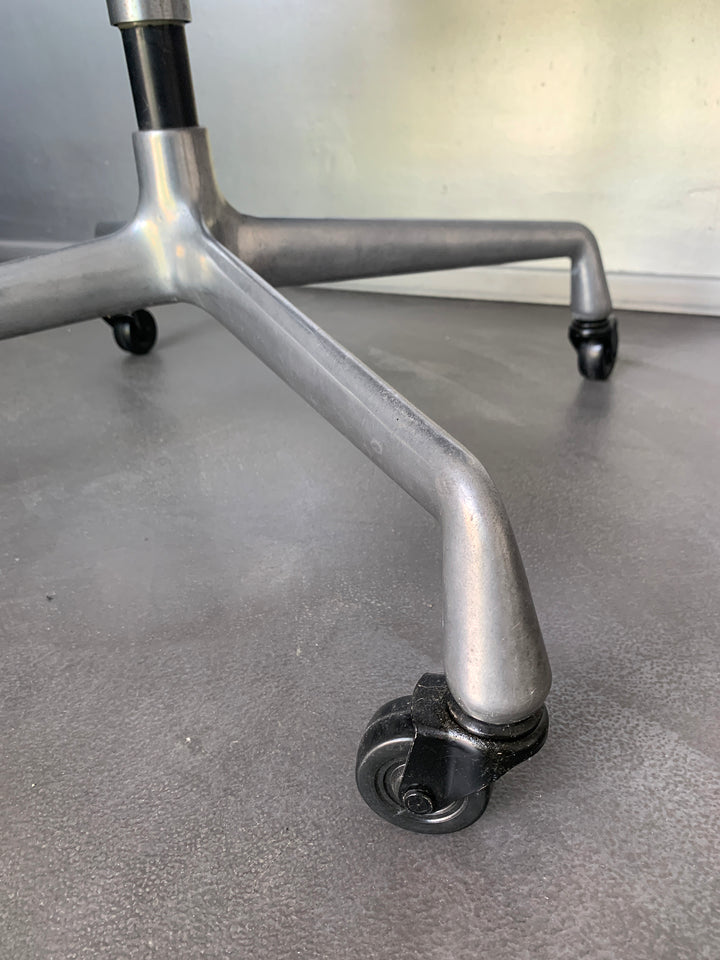 The EA117 Aluminium Group office chair is one of Charles and Ray Eames’s most celebrated designs for Herman Miller. First introduced in the late 1950s, the Aluminium Group series has become an icon of modern office furniture, valued for its elegant lines, ergonomic comfort, and timeless functionality. This model from the 1960s features a four-star base on casters, armrests, and a mechanism allowing height adjustment, tilt, and swivel. The polished aluminium base contrasts with the chromed seat structure, which shows some areas of peeling, consistent with its age. Overall, the chair remains in attractive vintage condition.