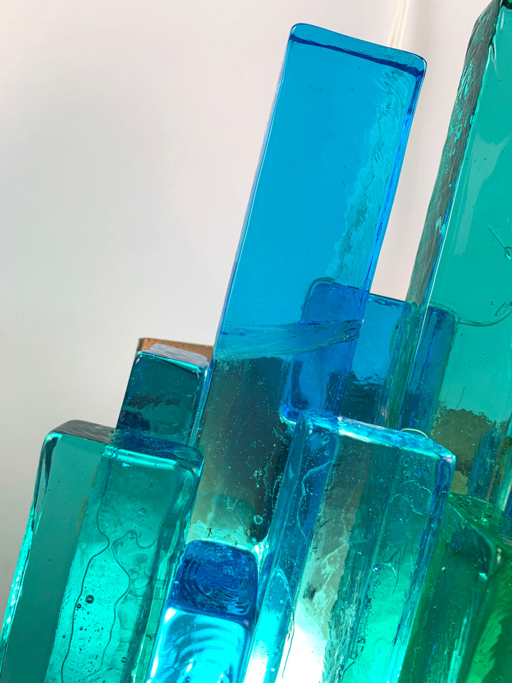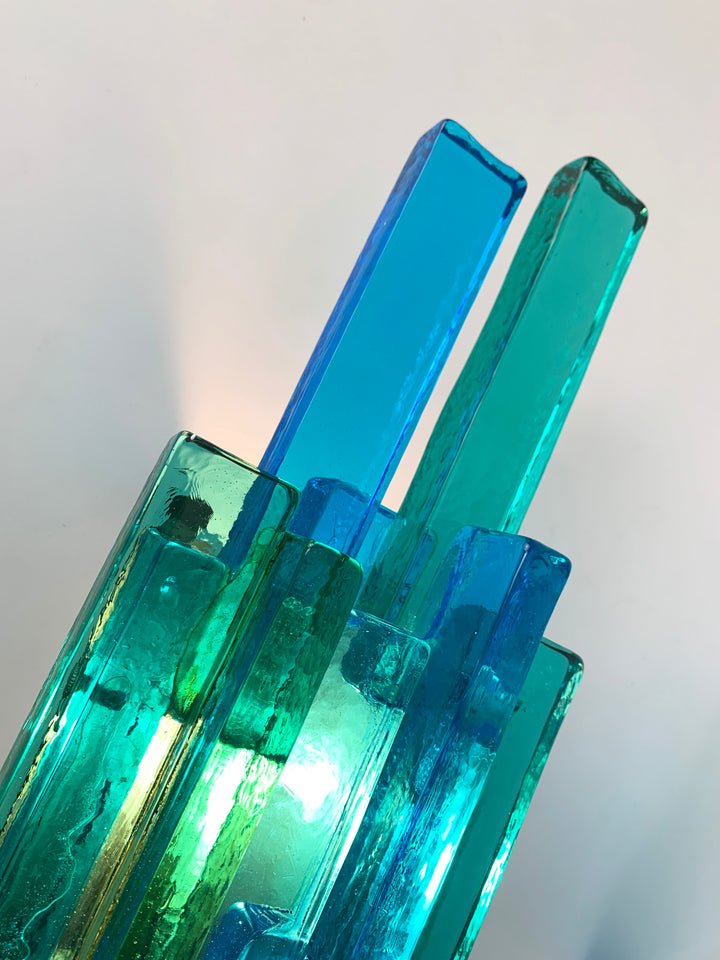 These sconces are composed of vertical blue glass slats, which catch and diffuse the light in a distinctive way, producing a warm and atmospheric glow. Both decorative and functional, they embody Holm-Sørensen’s signature mix of modernist rigor and joyful brutalism. A rare find in this bold blue glass, these pieces add a sculptural accent to any interior.