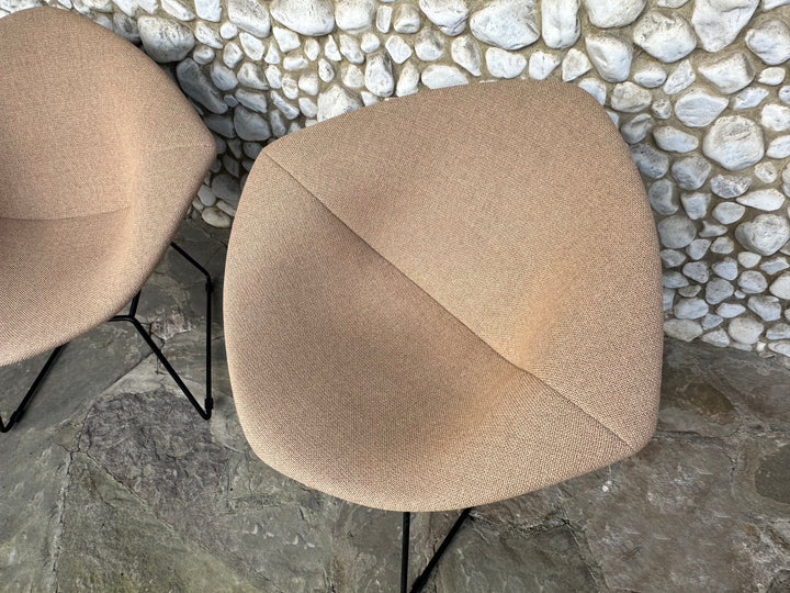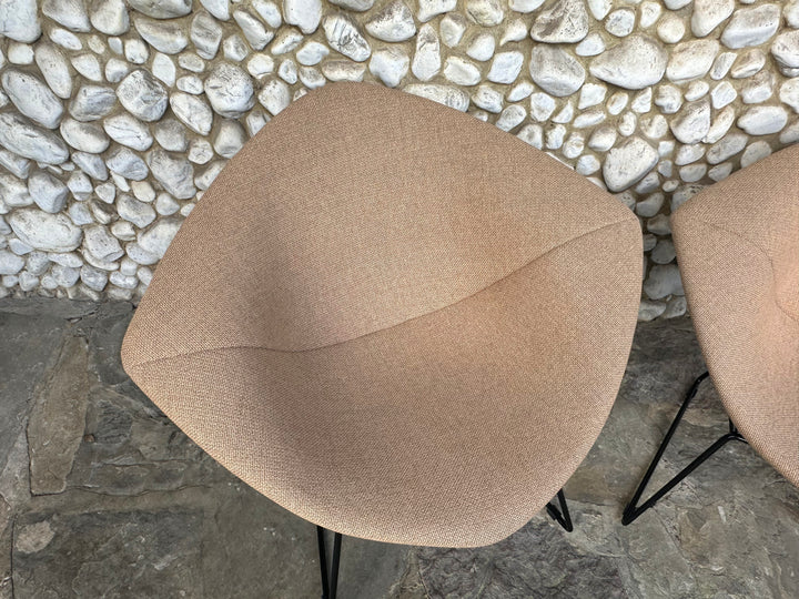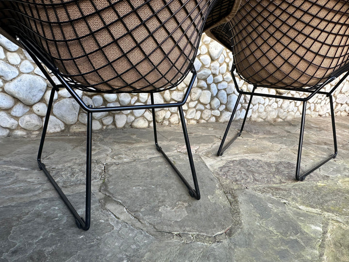 This pair features the characteristic black rilsan-coated steel wire structure, a synthetic finish typical of Knoll production from this period. The chairs are fitted with a new high-quality Italian full-cover, upholstered in a refined light brown “café au lait” tone, offering both comfort and elegance.