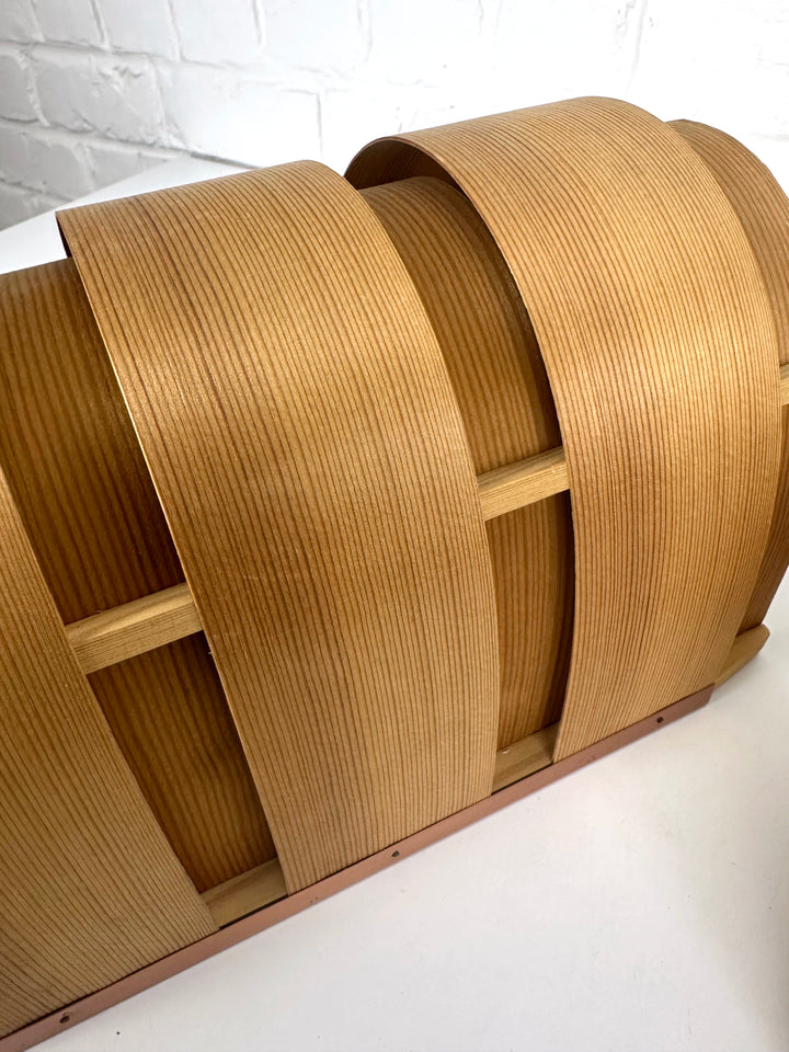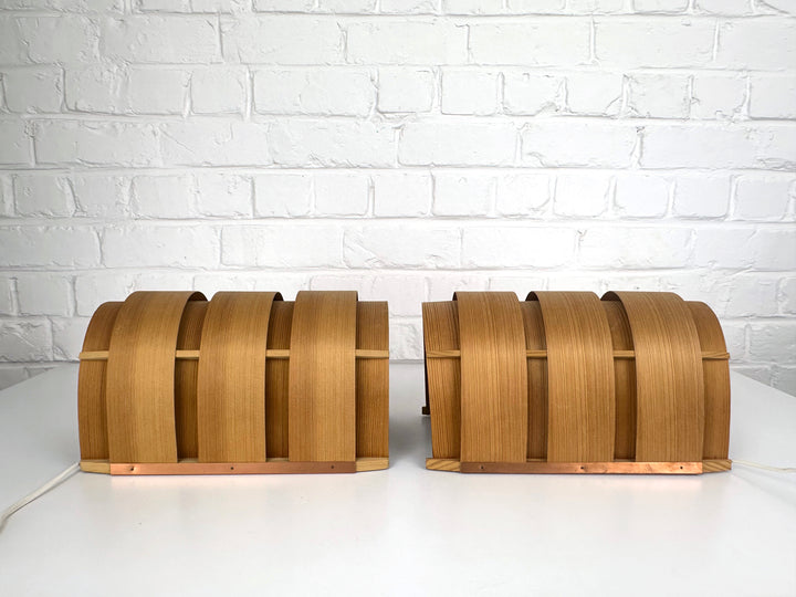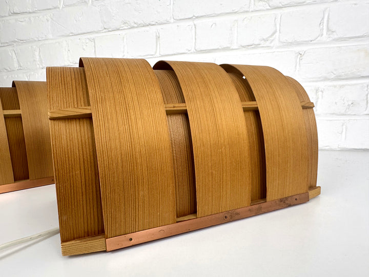 These sculptural wall lights are composed of bent pine veneer strips in a semi-circular form and mounted onto a solid pine frame with a copper back plate. The veneer softly diffuses the light, creating the warm and atmospheric glow characteristic of Jakobsson’s lighting designs.