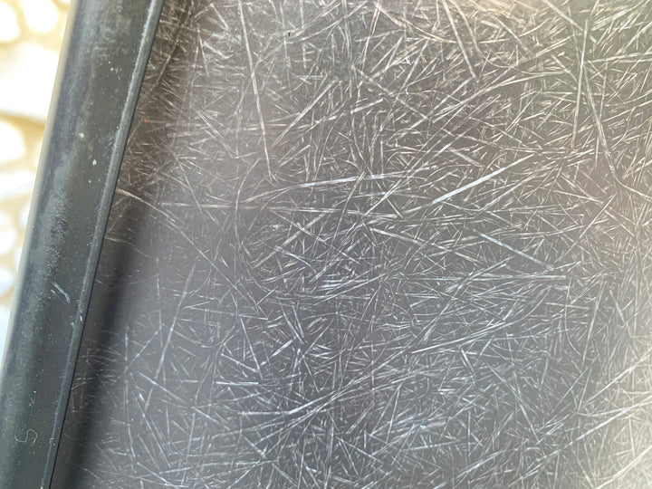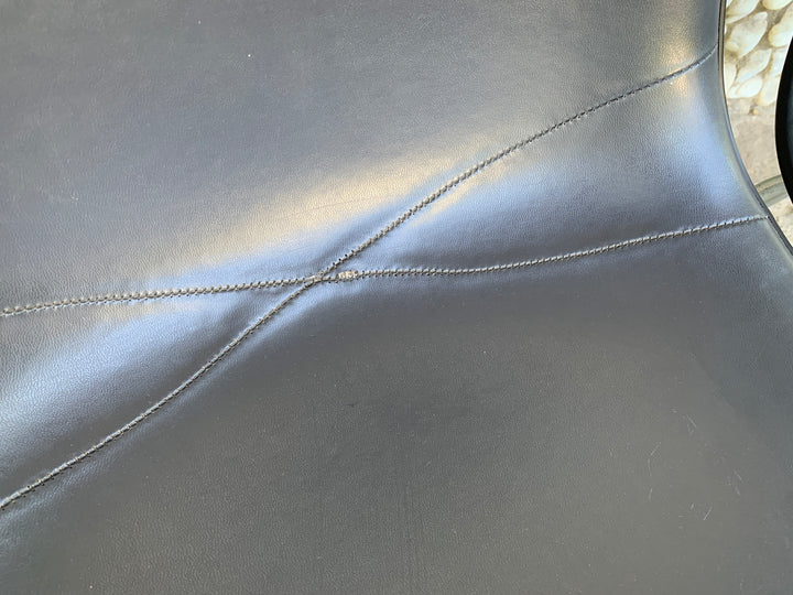 Set of 4 side chairs in dark grey fiberglass with dark grey Naugahyde upholstery. Naugahyde is the brand name of the vinyl (or faux-leather) Herman Miller used for their chairs.